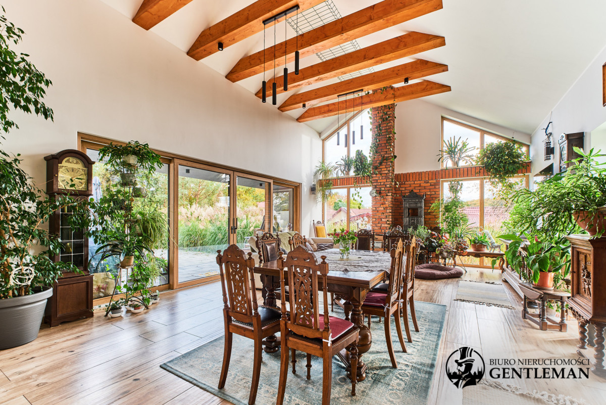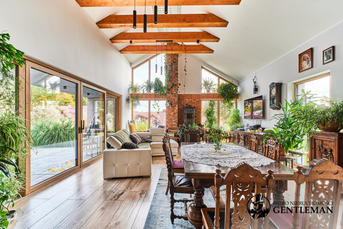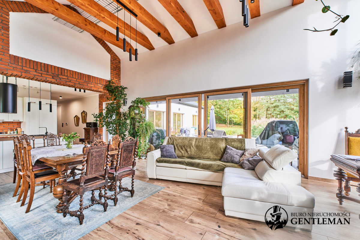 Dom urządzony jest z niezwykłym wyczuciem stylu i harmonii. Wysokie sufity z drewnianymi belkami oraz duże okna otwierające widok na zieleń nadają wnętrzom charakteru i wyjątkowo przytulnego klimatu.
