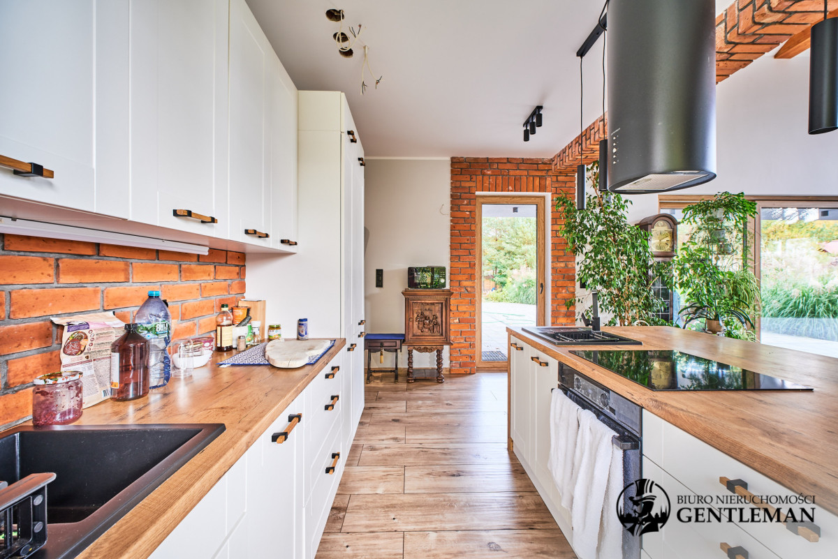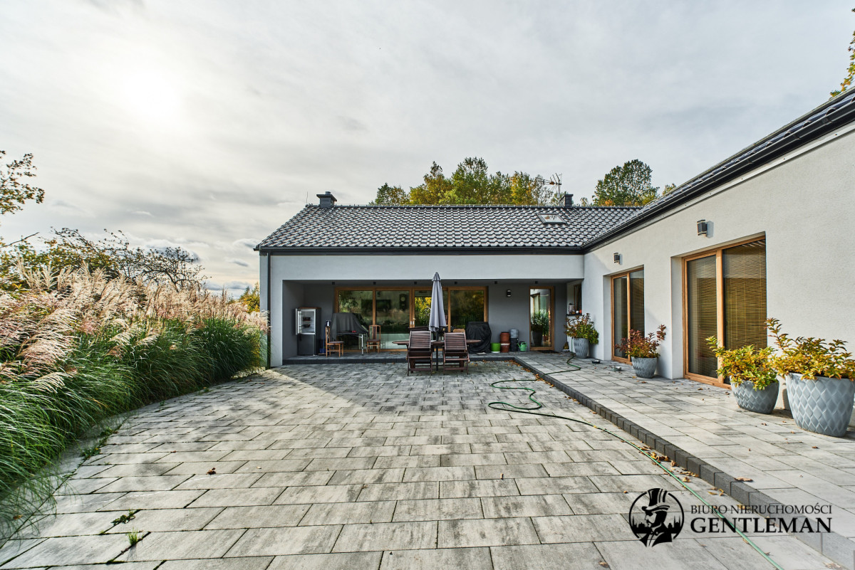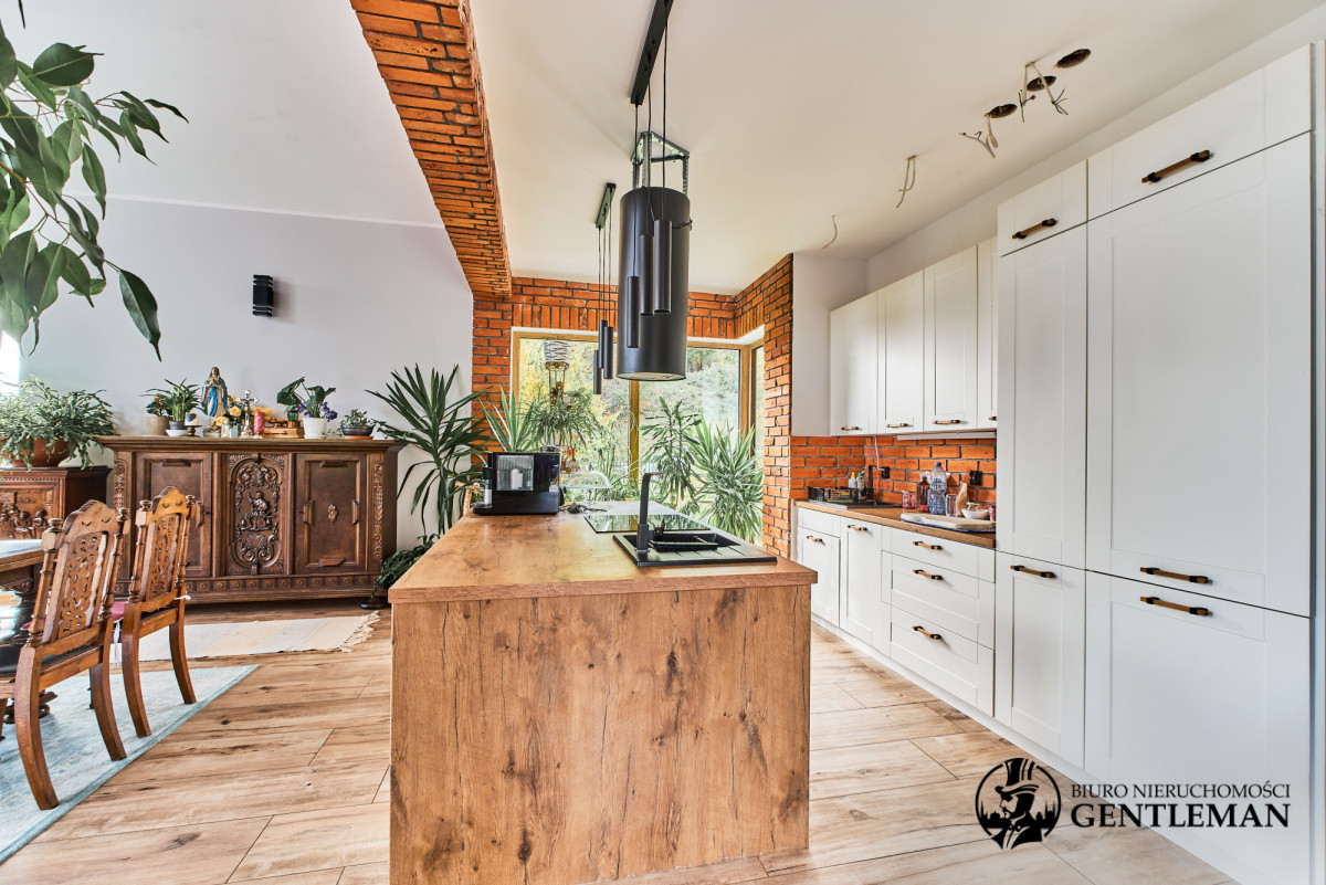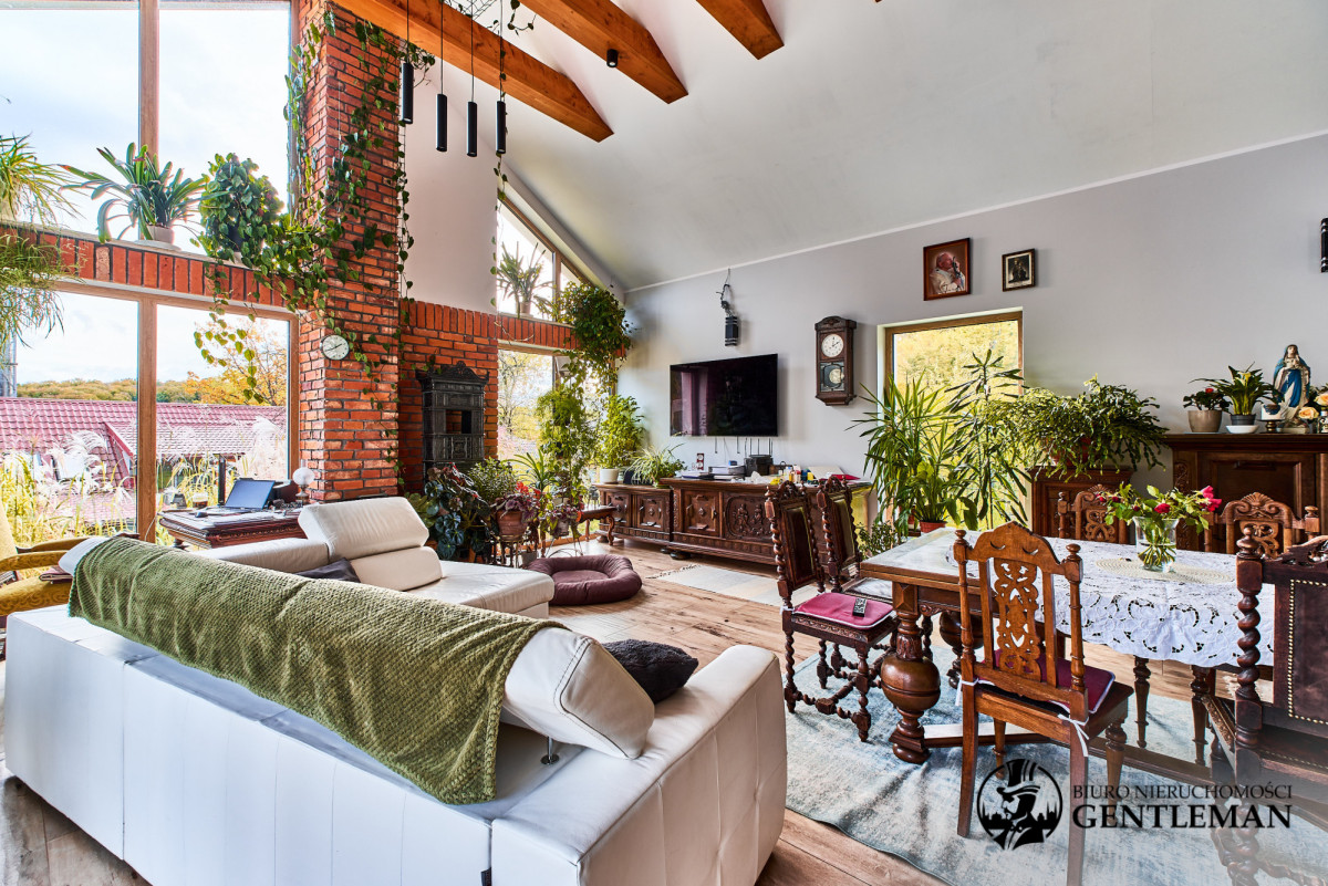 Dom urządzony jest z niezwykłym wyczuciem stylu i harmonii. Wysokie sufity z drewnianymi belkami oraz duże okna otwierające widok na zieleń nadają wnętrzom charakteru i wyjątkowo przytulnego klimatu.