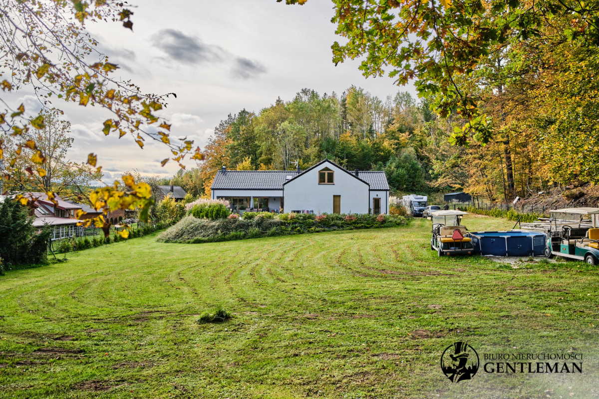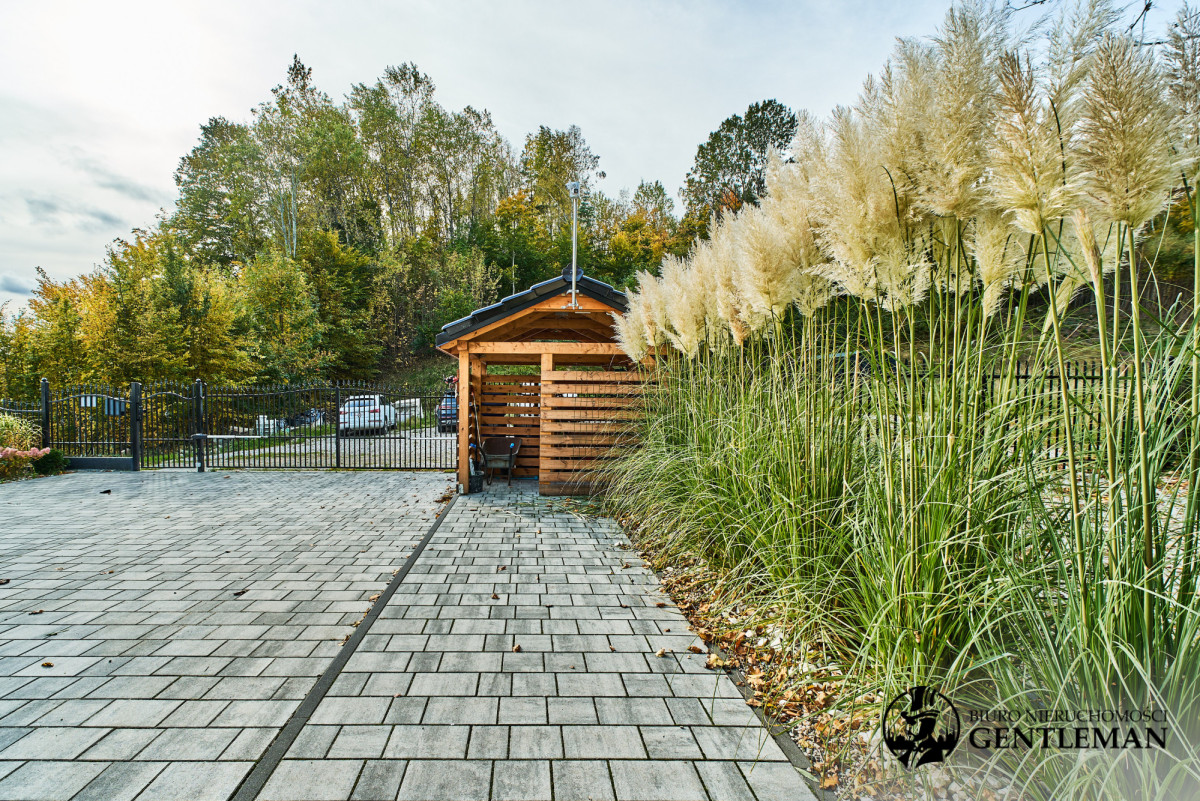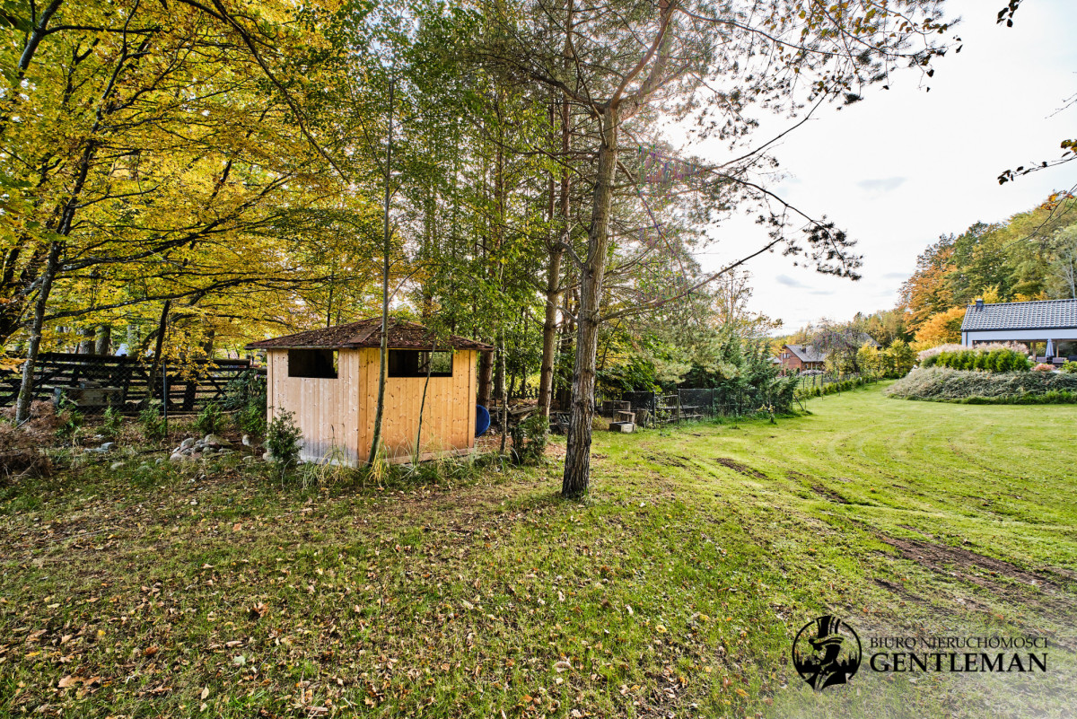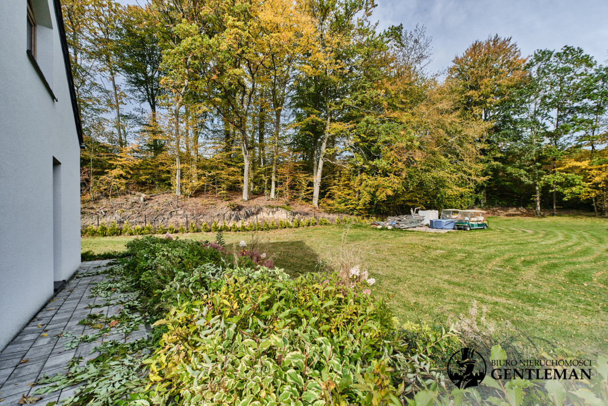 Pięknie zagospodarowany ogród z różnorodną roślinnością, świetnie utrzymaną zielenią oraz dużą przestrzenią do odpoczynku i rekreacji. Z tarasu można podziwiać kojące widoki na naturę, a las państwowy z aż dwóch stron działki, tuż za ogrodzeniem zapewnia dodatkową prywatność i wyjątkowy mikroklimat.